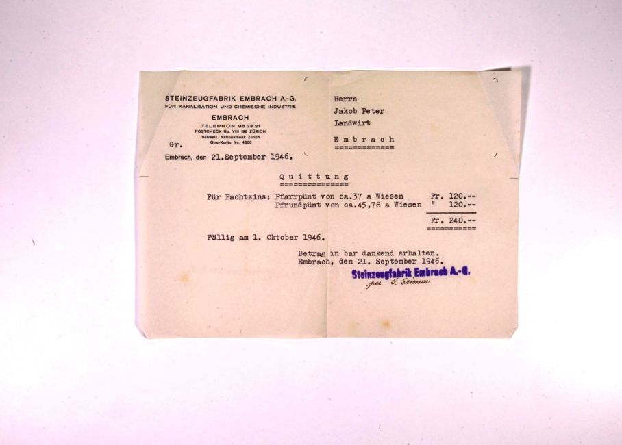Pachtzins für die Steinzeugfabrik Embrach
