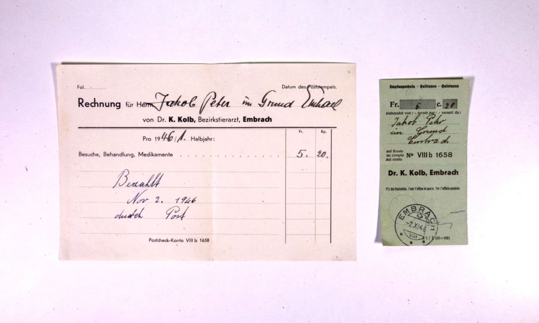 Dr. K. Kolb, Bezirkstierarzt, Schützenhausstrasse 27. Halbjahresrechnung, bezahlt durch Post. Quelle: Familienarchiv Peter.
