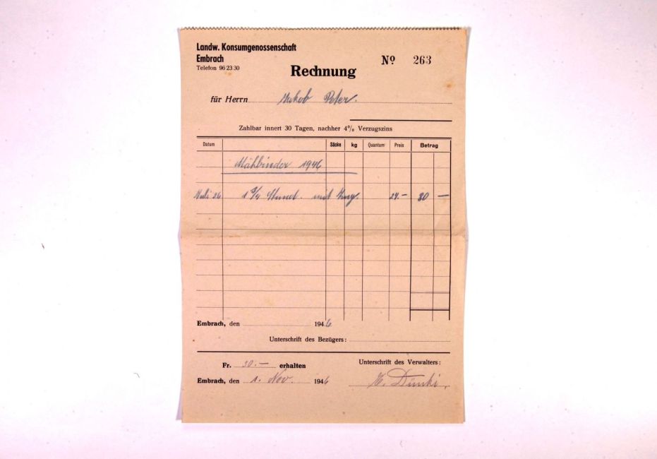 Mähbinder, Bindemäher der Landwirtschaftlichen Konsumgenossenschaft, Verwalter E. Dünki. Buch WS 120. Quelle: Familienachiv Peter.