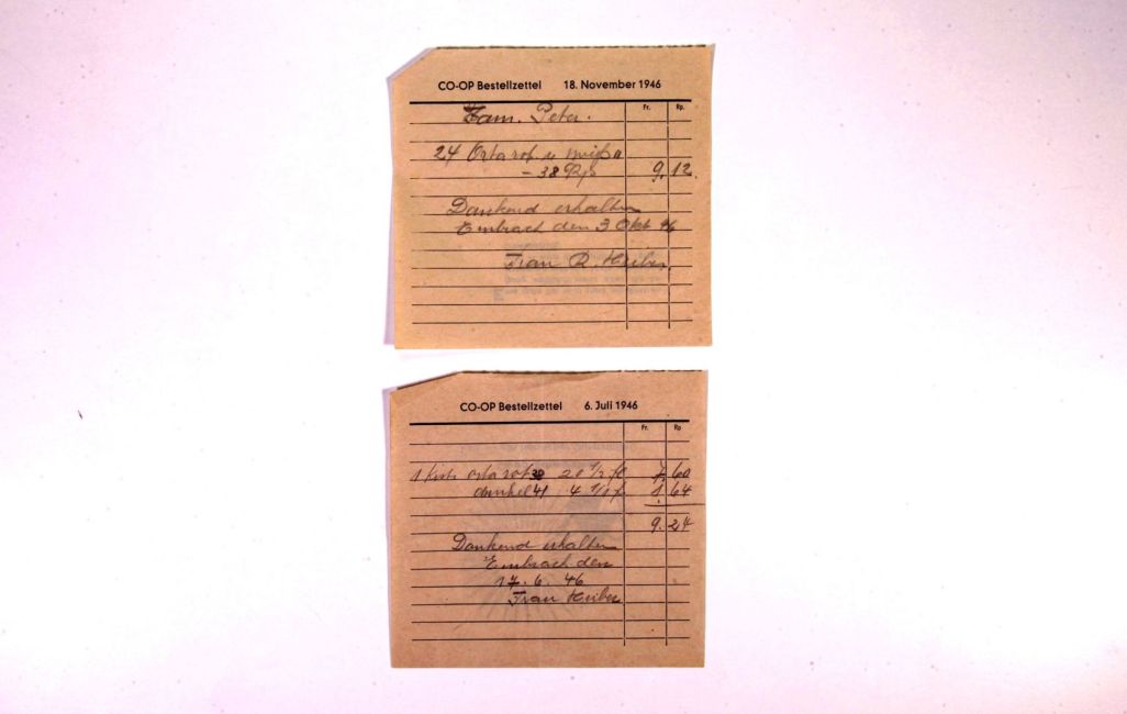 Bestellzettel der Konsumgenossenschaft Embrach COOP für Orta (Grenadinegetränk fer Mineralquelle Eglisau). Verkäuferin Frau Huber. Quelle: Familienarchiv Peter.