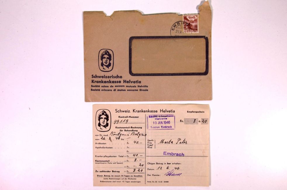 Krankenkasse Helvetia, Sektion Embrach, Kostenanteil für Röntgen im Balgrist. Kassier F. Kramer (?). Buch Seite 43. Quelle: Familienarchiv Peter