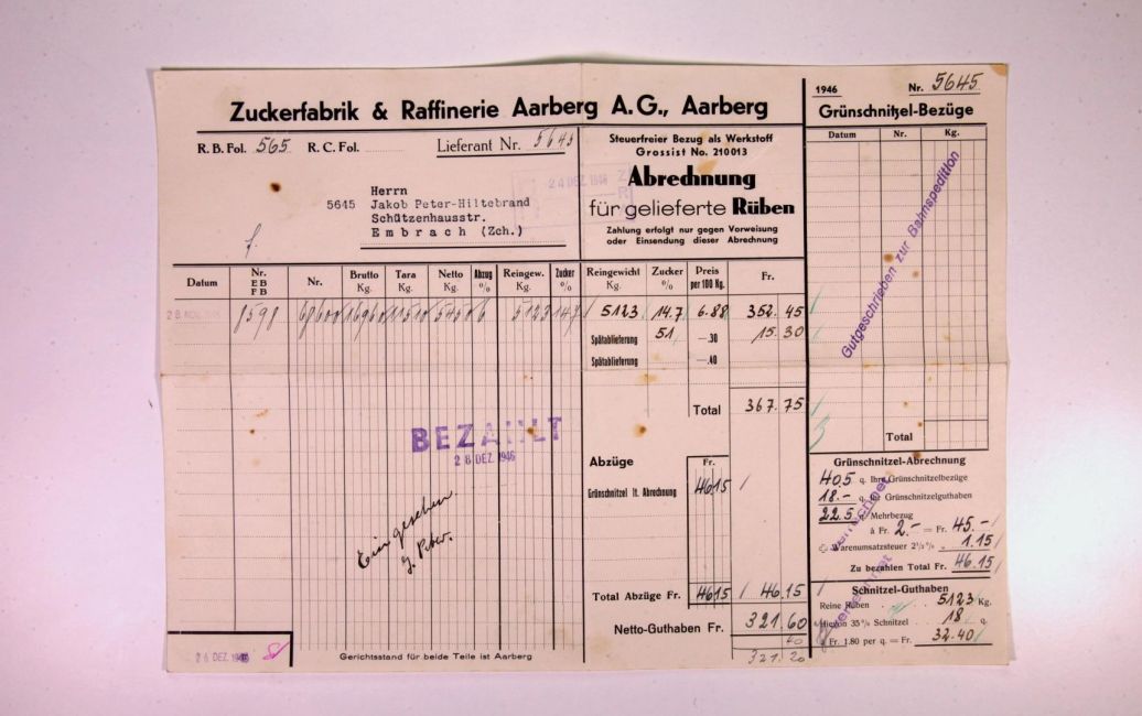 Abrechnung der Zuckerfabrik Aarberg für gelieferte Zuckerrüben, Abrechnung für Grünschnitzel. Buch WS 103. Quelle: Familienarchiv Peter