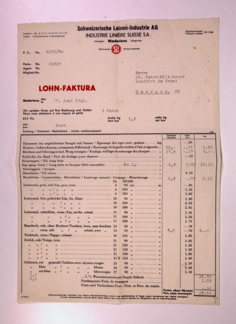 Abrechnung der Schweizerischen Leinenindustrie AG Niederlenz für die Verarbeitung von Hanf. Buch WS 104 und 153. Quelle: Familienarchiv Peter.