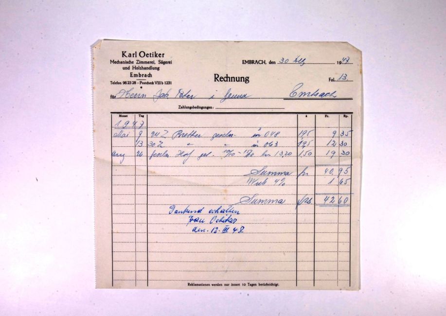 Karl Oetiker, mechanische Zimmerei, Sägerei und Holzhandlung. Breitestrasse 9. Bretter geschnitten.