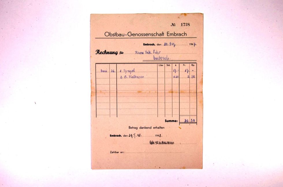 Spritzmittel der Obstbaugenossenschaft, bezahlt an Oskar Weidmann. Insektizid, Pestizid, Grapol, Kalkarsen. Buch WS 88. Quelle: Familienarchiv Peter