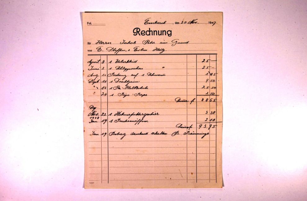 Handlung E. Steffen Erben, Bertha Bänninger. Dorfstrasse / Ecke Bankstrasse. Überkleid, Schlepprechen, Drahtzaine, Halbschuhe, Rips-Raps (?), Hühnerfuttergeschirr, Büchsenöffner. Buch WS 73. Quelle: Familienarchiv Peter