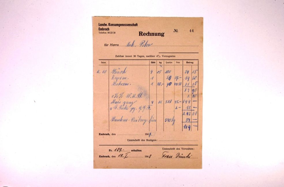 Viehfutter von der Landwirtschaftlichen Konsumgenossenschaft. Krüsch (Weizenkleie), Rapsmehl, Kokosmehl, Mais. Verwalter Frau Dünki. Buch WS 114. Quelle: Familienarchiv Peter