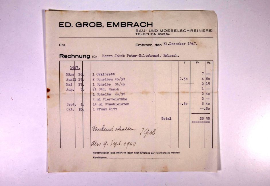 Eduard Grob, Bau- und Möbelschreinerei, Schützenhausstrasse 21. 1 Ovalbrett für Brandmalerei, Scheiben, Viertelstäbe, Staubleisten, 1 Pfund Kitt. Quelle: Familienarchiv Peter.