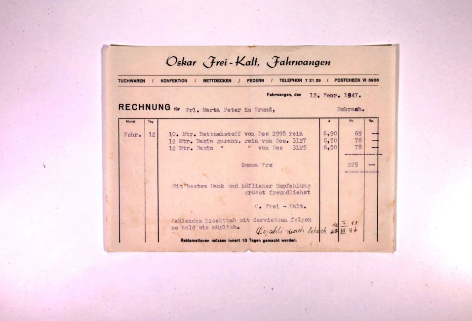 Aussteuer für Martha Peter. Oskar Frei-Kalt, Fahrwangen. Betttuchstoff, Bazin.