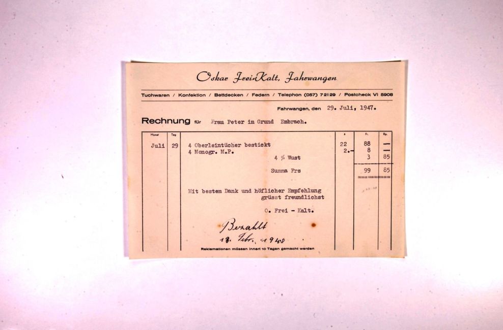 Aussteuer für Martha Peter von Oskar Frei-Kalt, Fahrwangen. Oberleintücher bestickt, Monogramm.