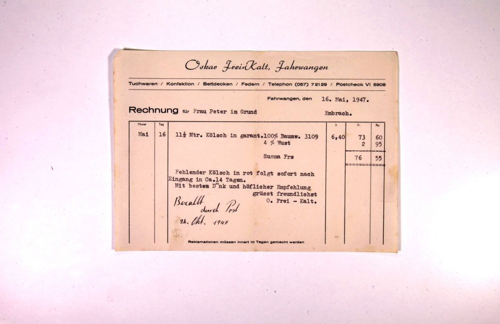 Aussteuer für Martha Peter von Oskar Frei-Kalt, Fahrwangen. Kölsch. Baumwolle.