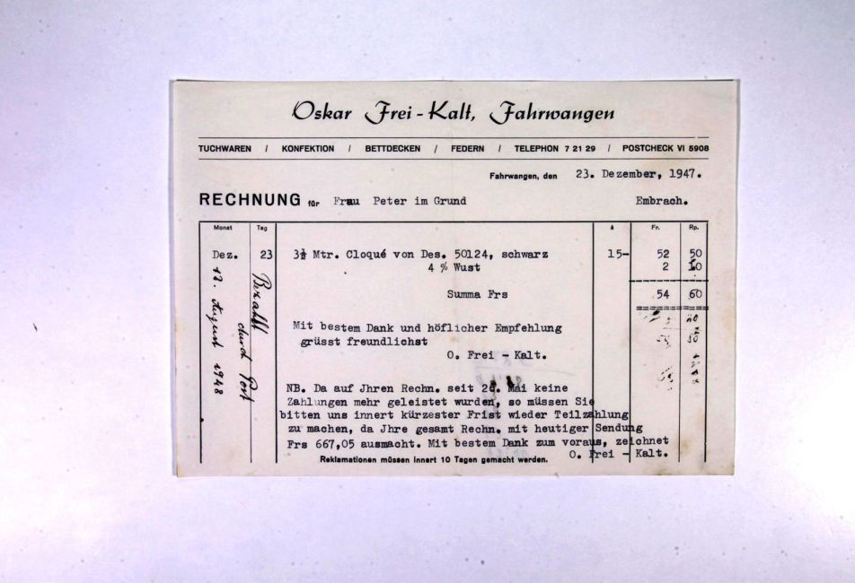 Aussteuer für Martha Peter von Oskar Frei-Kalt, Fahrwangen. Mahnung. Cloqué.