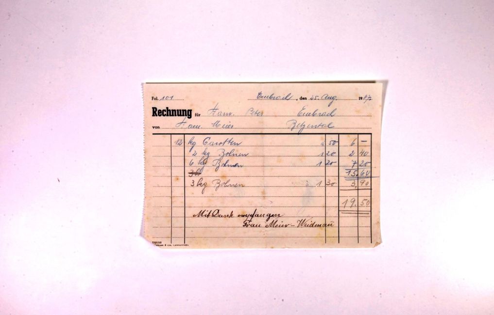 Zukauf von "Garotten" (Karotten, Rüebli) und Bohnen aus dem Garten von Frau Meier-Weidmann. Buch WS 40. Quelle: Familienarchiv Peter.