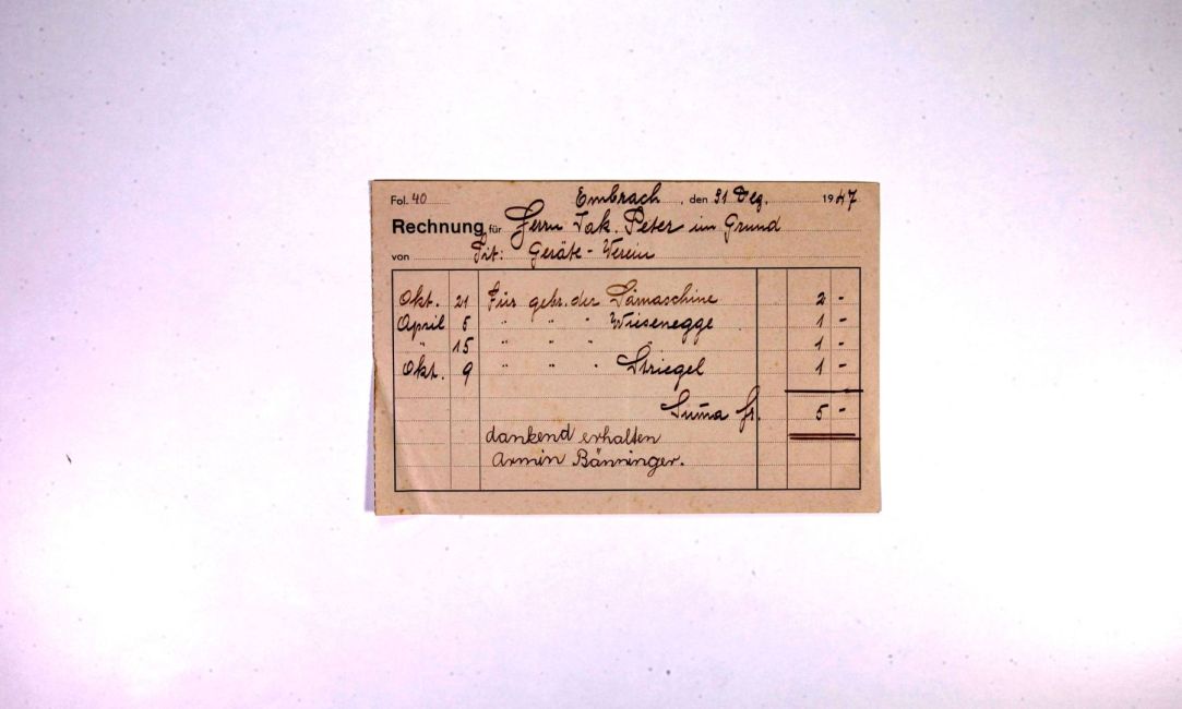 Sämaschine, Wiesenegge und Wiesenstriegel vom Geräteverein ausgeliehen. Striegel. Kassier Armin Bänninger. Buch WS 121. Quelle: Familienarchiv Peter.