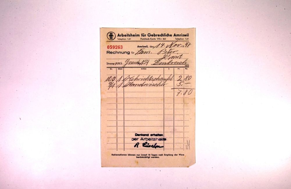 Arbeitsheim für Gebrechliche Amriswil. Kehrichtschaufel, Handwischer. Buch WS 54. Quelle: Familienarchiv Peter