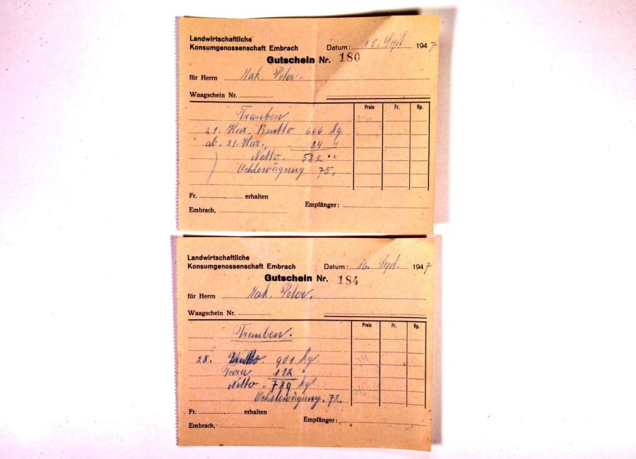 Wümmet, Ablieferung der Trauben an die Landwirtschaftliche Konsumgenossenschaft, Öchslewägung 72 und 75. Quelle: Familienarchiv Peter
