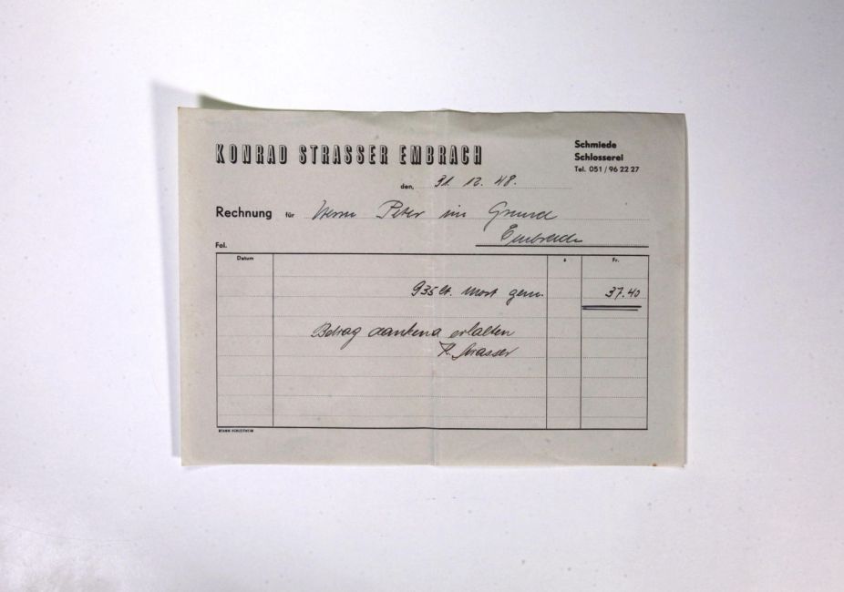 Konrad Strasser, Schmiede, Schlosserei, Pfarrhausstrasse 2. Nachfolger von K. Kärcher und letzter Schmied von Embrach. 935 Liter Most gemacht. Quelle: Familienarchiv Peter.