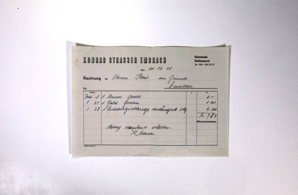Konrad Strasser, Schmiede, Schlosserei, Pfarrhausstrasse 2. Nachfolger von K. Kärcher und letzter Schmied von Embrach. 1 Messer geschliffen, 1 Gabel geschweisst, 1 Anhangestange (?) verlängert. Quelle: Familienarchiv Peter.