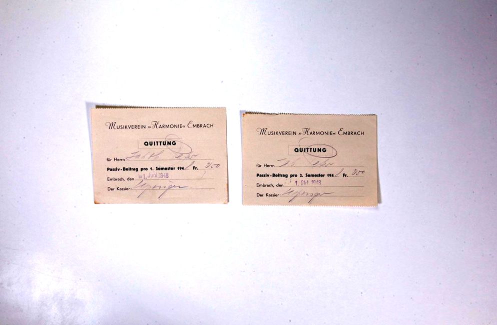 Musikverein Harmonie. Semesterbeitrag für Passivmitglieder. Kassier Utzinger. Quelle: Familienarchiv Peter