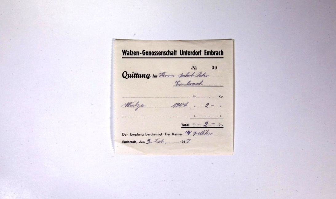 Walzengenossenschaft Unterdorf Embrach. Kassier Walter Zolliker. Quelle: Familienarchiv Peter
