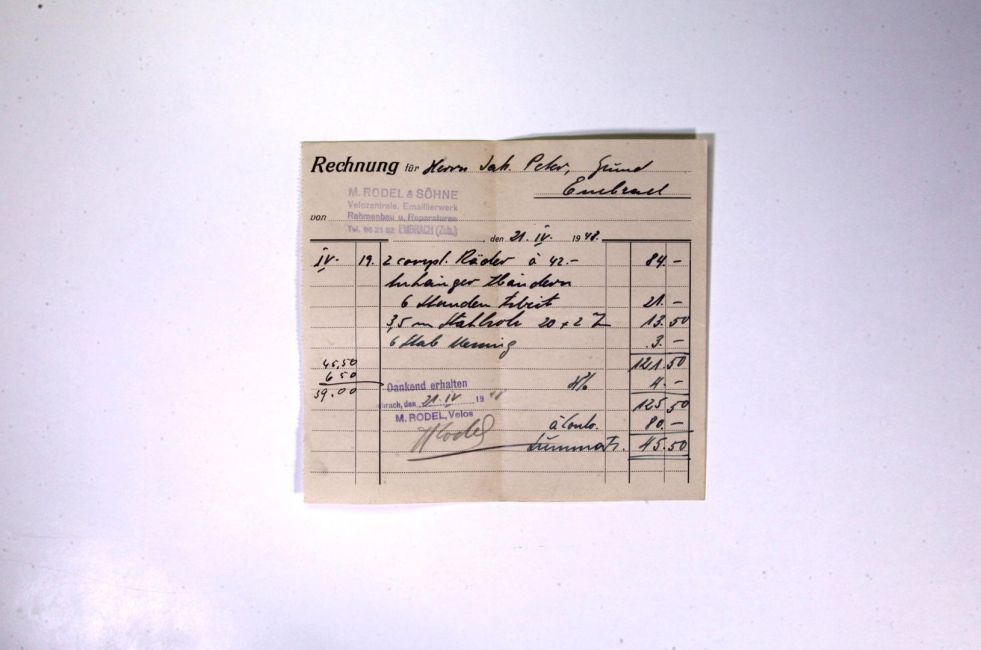 M. Rodel und Söhne, Velozentrale, Emaillierwerk, Rahmenbau und Reparaturen. Oberdorfstrasse 5. 2 Räder, Anhänger abändern, Stahlrohr, Stab Messing. Quelle: Familienarchiv Peter
