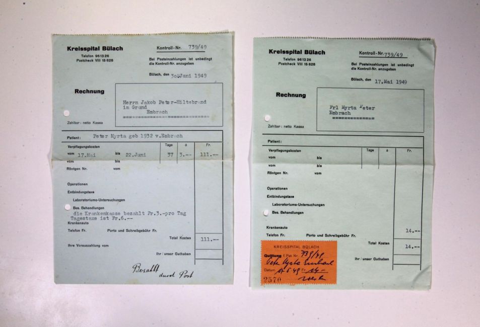 Kreisspital Bülach, Aufenthalt von Myrta Peter. Krankenkasse zahlt Fr. 3 pro Tag, der Tagessatz beträgt Fr. 6.- pro Tag. Transport mit dem Krankenauto kostet Fr. 14.- Buch Seite 80. Quelle: Familienarchiv Peter