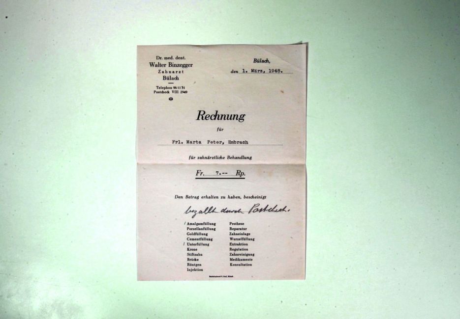 Zahnarzt Walter Binzegger Bülach. 1 Amalgamfüllung für Frl. Marta Peter. Buch WS 11. Quelle: Familienarchiv Peter.