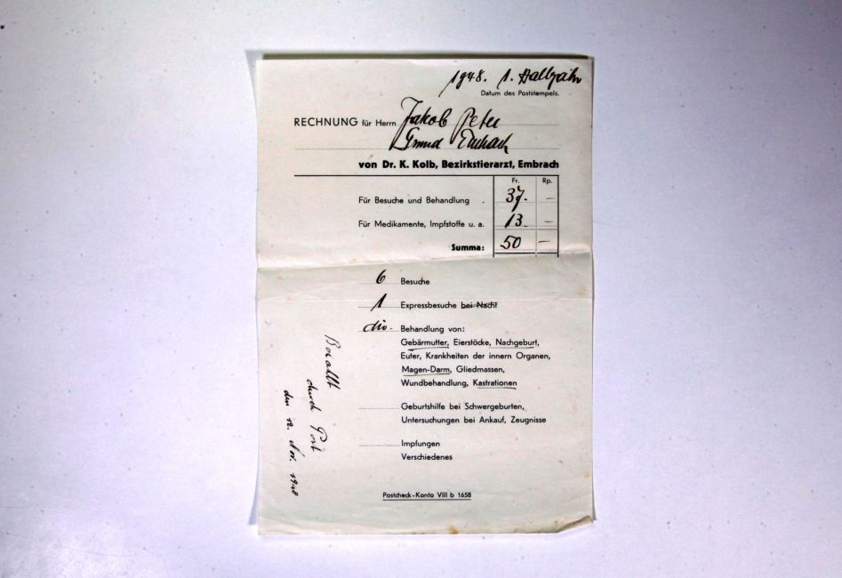 Dr. K. Kolb, Bezirkstierarzt, Schützenhausstrasse 27. Halbjahresrechnung für Besuche und Behandlung, Medikamente und Impfstoff. Bezahlt durch Post. Quelle: Familieanarchiv Peter.