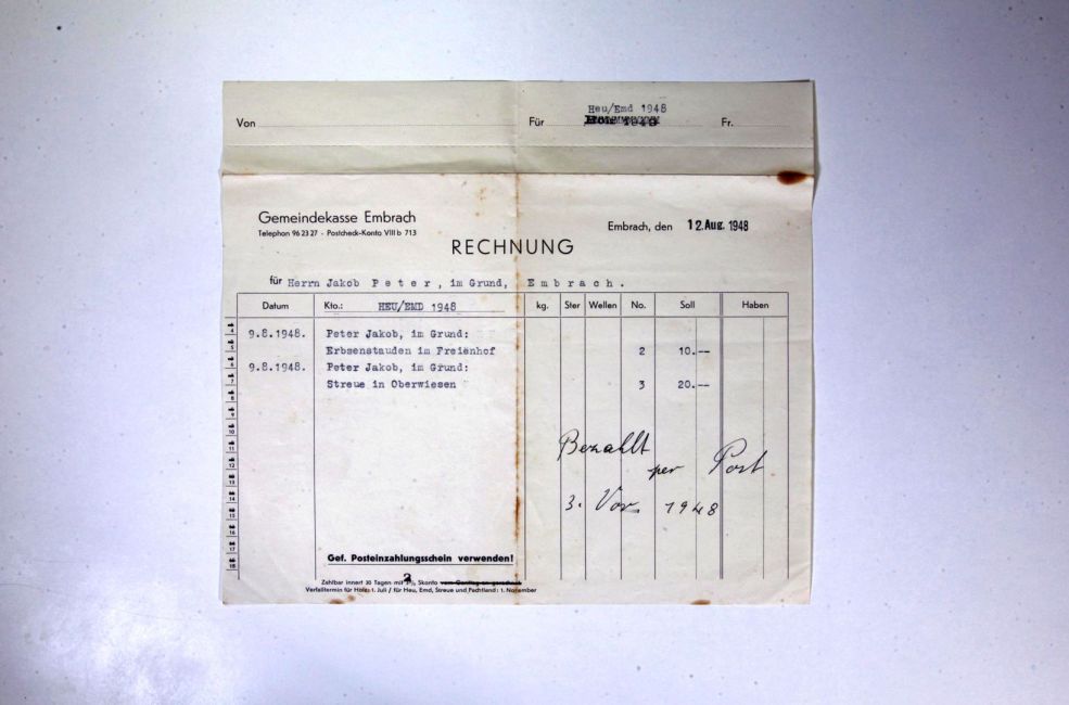 Erbsenstauden im Freihof, Streue in Oberwiesen. Gemeindekasse Embrach. Gef. Posteinzahlungsschein verwenden. Buch WS 129. Quelle: Familienarchiv Peter