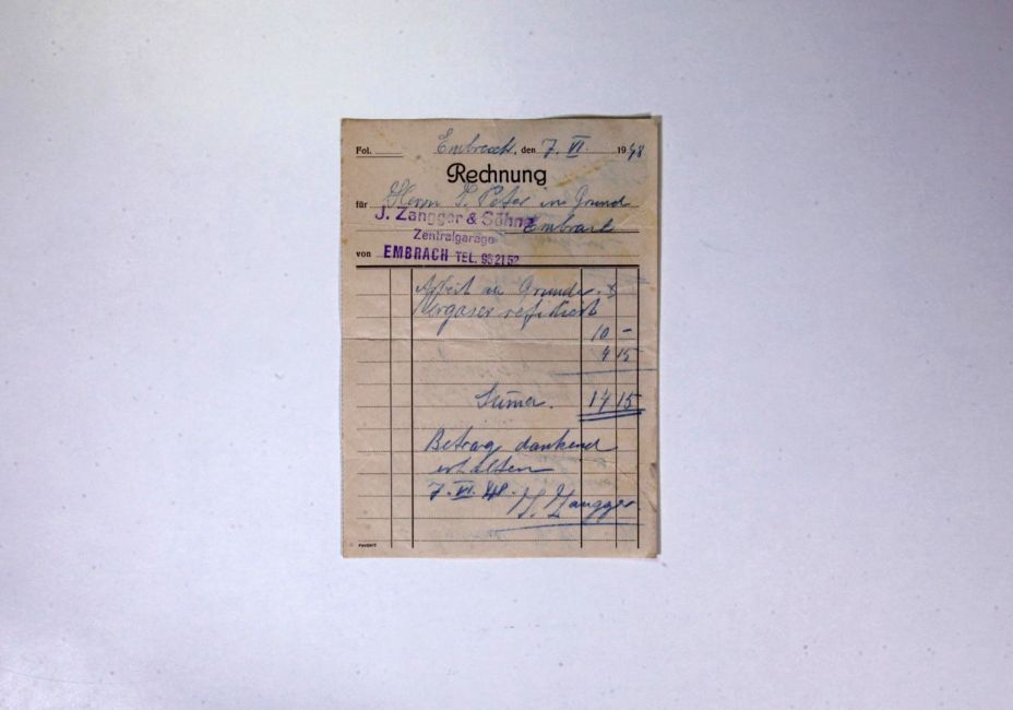 Jakob Zangger, Zentralgarage, Oberdorfstrasse 19, Nachfolger von Johann Keller. Arbeit am Grunder (Motormäher), Vergaser revidiert. Quelle: Familienarchiv Peter.