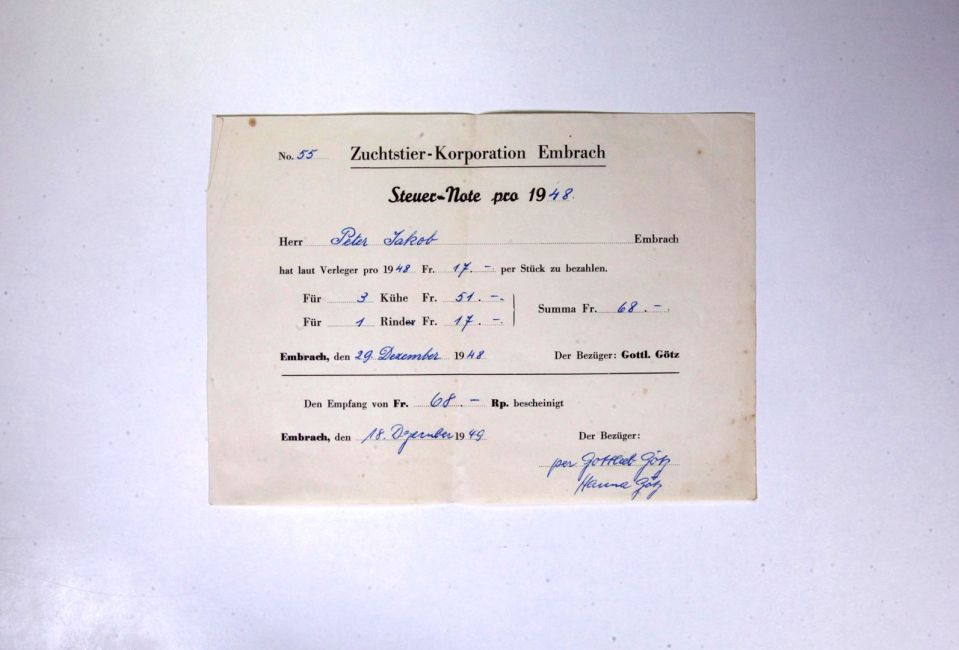 Steuernote der Zuchtstierkorporation für 3 Kühe und 1 Rind. Bezüger Gottlieb Götz, bezahlt an Hanna Götz. Quelle: Familienarchiv Peter.