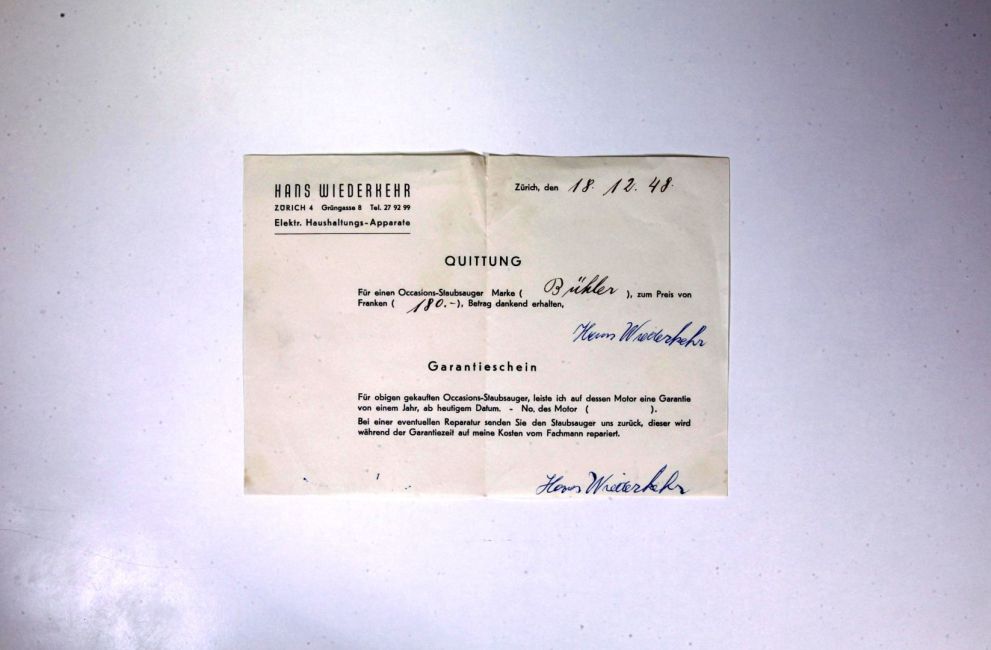 Occasionsstaubsauger Marke Bühler von Hans Wiederkehr, elektrische Haushaltungsapparate, Zürich. Buch WS 36. Quelle: Familienarchiv Peter.
