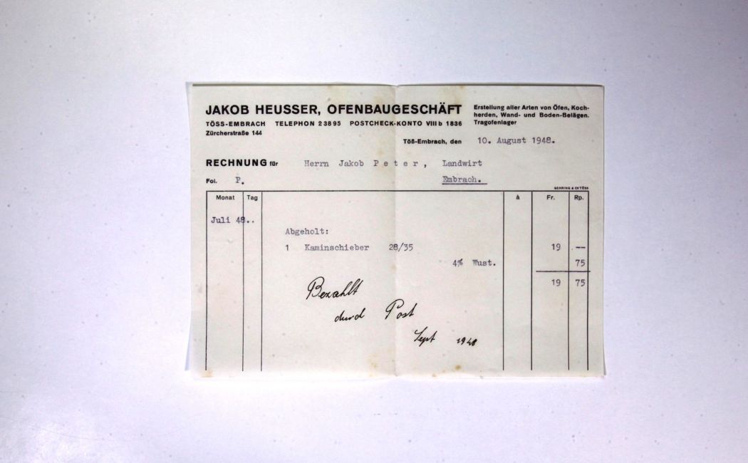 Jakob Heusser, Ofenbaugeschäft, wohnhaft Amtshausgasse 6, Geschäft in Winterthur-Toss. Ofenbauer. Erstellung aller Arten von Öfen, Kochherden, Wand- und Bodenbelägen, Tragofenlager. 1 Kaminschieber (für den neuen Kamin in der Waschküche). Quelle: Familienarchiv Peter.