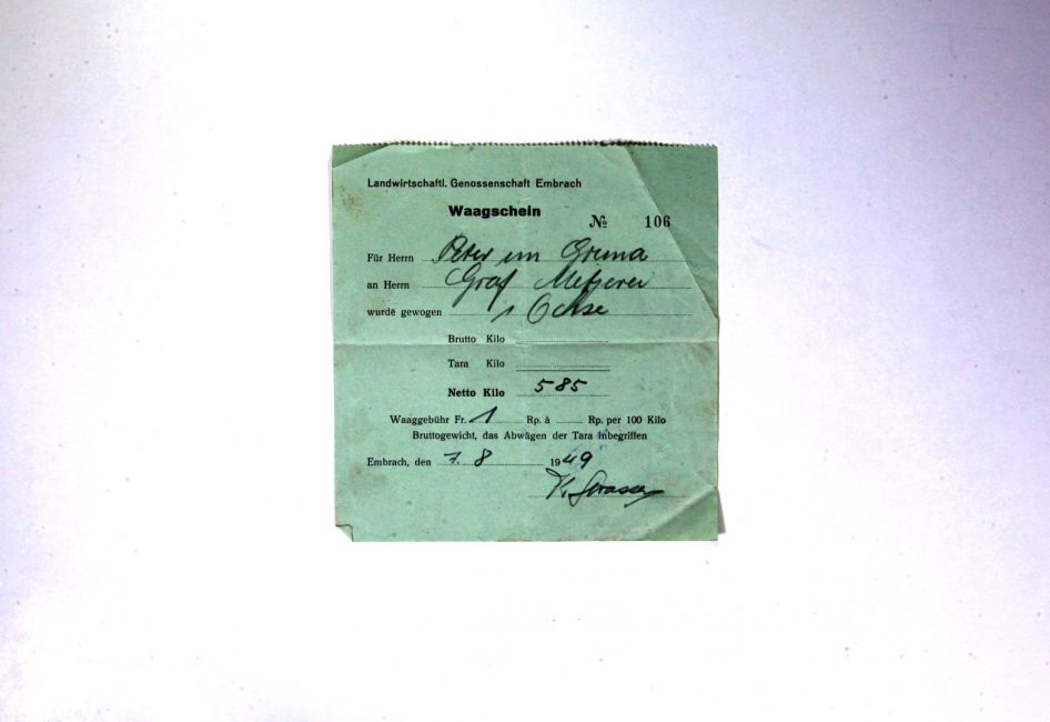 Der Zugochse wird geschlachtet. Metzgerei Graf. Waagschein. Buch Seite 125. Quelle: Familienarchiv Peter.