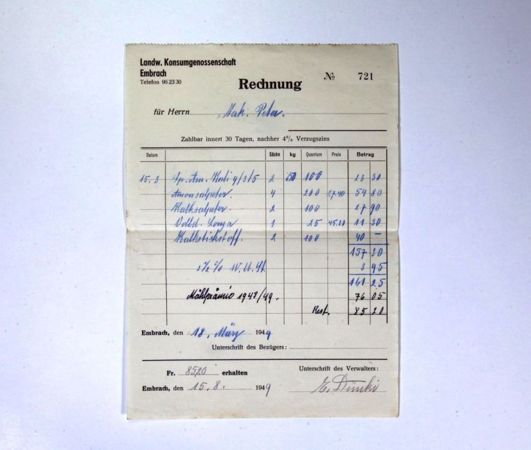 Dünger von der Landwirtschaftlichen Konsumgenossenschaft. Ammonsalpeter, Kalksalpeter, Volldünger Lonza, Kalkstickstoff. Mahlprämie. Verwalter E. Dünki. Buch WS 85. Quelle: Familienarchiv Peter.