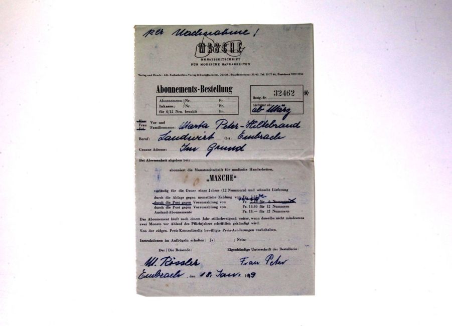 Masche Monatszeitschrift für modische Handarbeiten. Abonnement per Nachnahme. Buch WS 180. Quelle: Familienarchiv Peter.