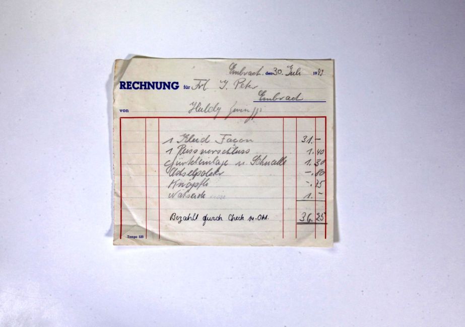 Huldy Zwinggi, Schneiderin, Obermühle. 1 Kleid Façon (nach Schnittmustervorlage), 1 Reissverschluss, Gürteleinlage und Schnalle, Achselpolster, Knöpfe, Nähseide. Bezahlt durch (Post-) Check. Quelle: Familienarchiv Peter.