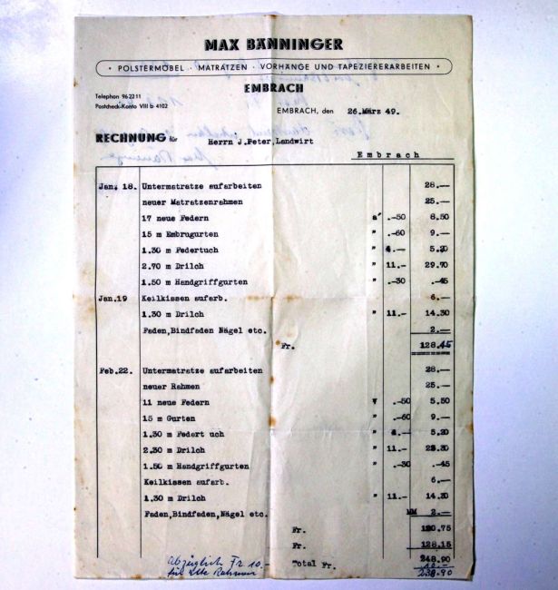 Max Bänninger, Polstermöbel, Matratzen, Vorhänge, Tapezierarbeiten Zürcherstrasse 2 / Hintergasse. Untermatratze, Matratzenrahmen, Federn, Embrugurten, Drilch, HAndgriffgurten, Keilkissen. Buch WS 1. Quelle: Familienarchiv Peter
