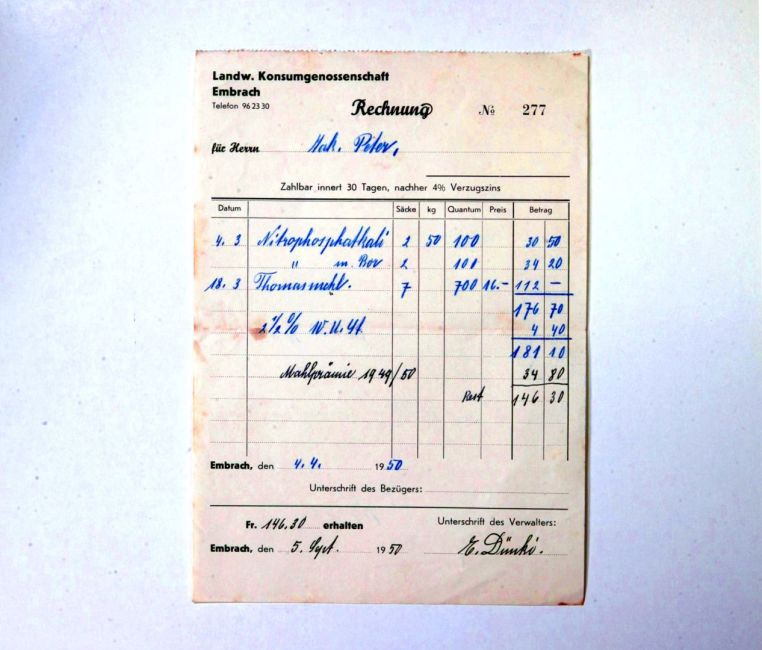 Dünger von der Landwirtschaftlichen Konsumgenossenschaft: Nitrophosphatkali, Bor, Thomasmehl. Mahlprämie. Buch WS 86. Quelle: Familienarchiv Peter