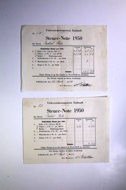Viehversicherungskreis Embrach. Viehversicherung für 3 Kühe, 2 Ochsen, 1 Rind, 2 Mastschweine und 2 Kälber ("1 Ochse und 1 Rind"). Kassier A. Walder.