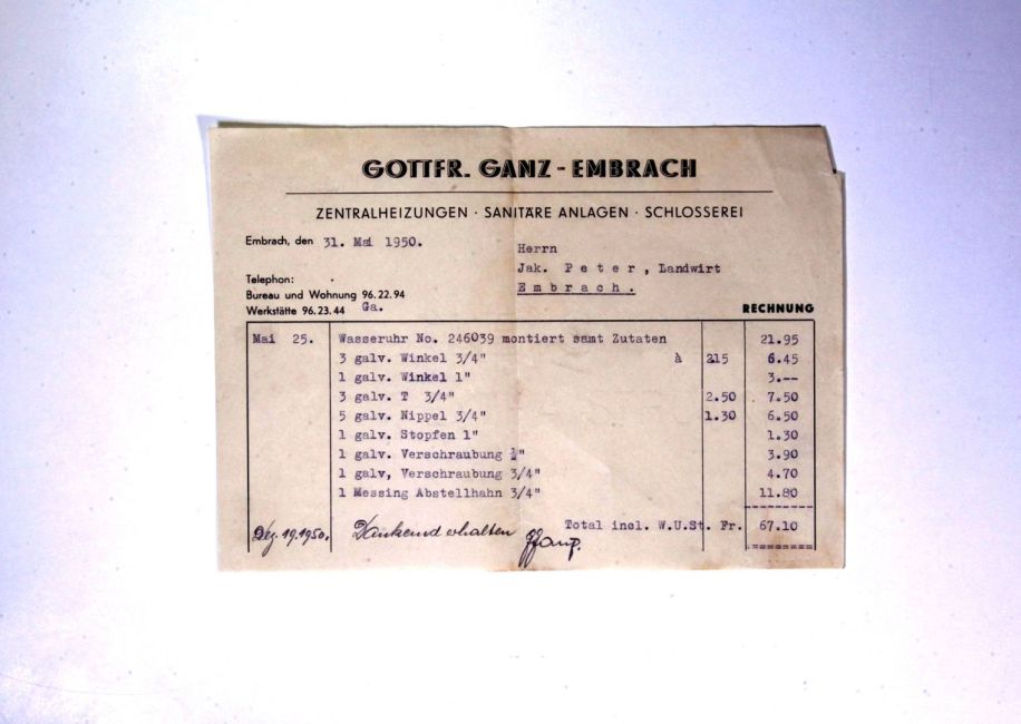 Gottfried Ganz, Zentralheizungen, sanitäre Anlagen, Schlosserei. Stationsstrasse 58. Installation einer Wasseruhr. Buch WS 2. Quelle: Familienarchiv Peter.