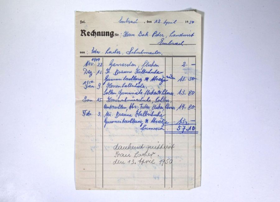 Schuhmacher Lacher. Gamaschen, Halbschuhe. Gummisohlen. Buch WS 58. Quelle: Familienarchiv Peter.