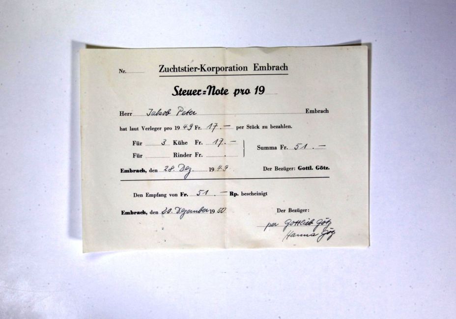 Steuernote der Zuchtstierkorporation für 3 Kühe. Bezüger Gottlieb Götz, bezahlt an Hanna Götz.