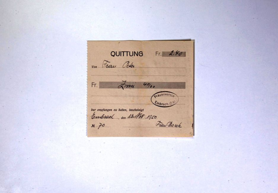 Frauenverein Embrach. Jahresbeitrag. Kassierin Frau Marek. Quelle: Familienarchiv Peter.