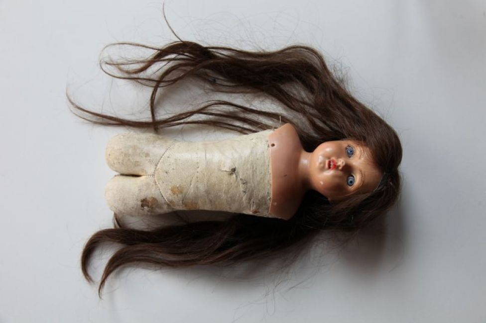 Celluloidpuppe mit Echthaar, aufgenommen 2017. Puppe