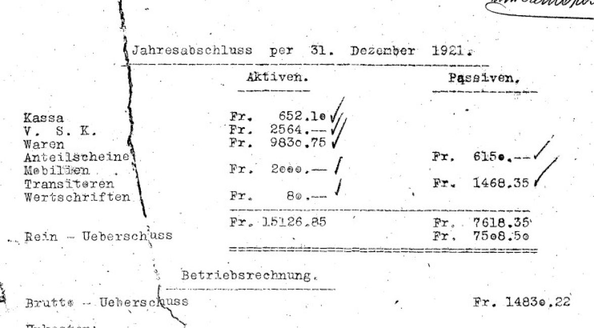 Jahresabschluss Konsumgenossenschaft Embrach 1921. Laden Dorfstrasse 47. Quelle: Archiv Coop, Basel.