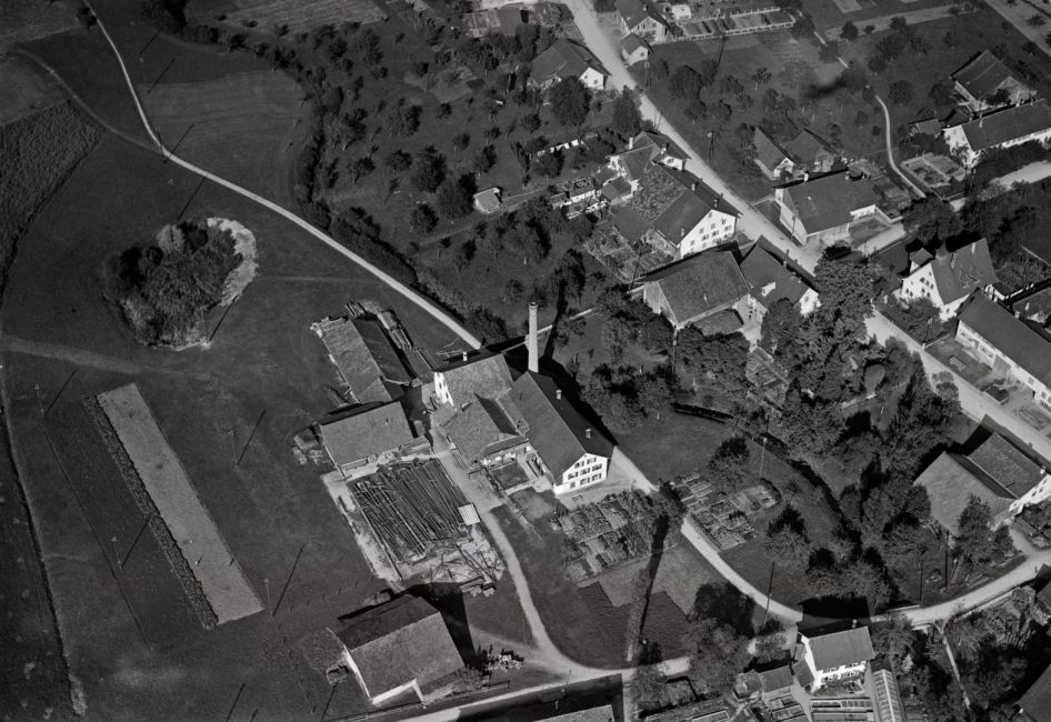 Luftaufnahme der Zimmerei Bächi (vorher Röhrenfabrik Ganz) von Walter Mittelholzer am 8.10.1924.