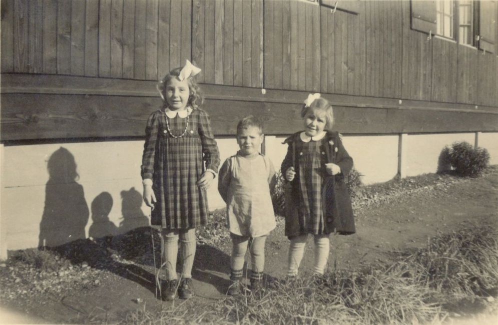 Vor der Wohnbaracke Rheinstrasse/Rosenweg: Meia Maurer (verh. Knobel); Rolf, geb. 1946; Lilly, geb. 1944. Kinder