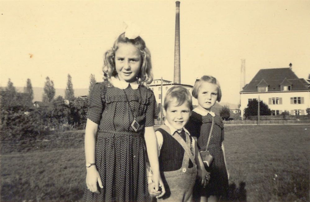 Vor der Steinzeugfabrik: Meia Maurer (verh. Knobel), geb. 1942; Bruder Rolf, geb. 1946, Schwester Lilly, geb. 1946. Kinder