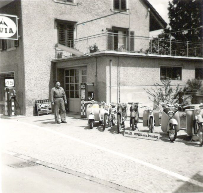 E. Saurenmann Dorfstrasse 82. Roller und Mopeds ohne Anzahlung. Avia-Tankstelle. Werbeschild. Personen. Quelle: W. Saurenmann.